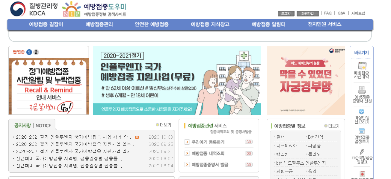 다음은 예방접종 도우미 사이트의 공지사항입니다.